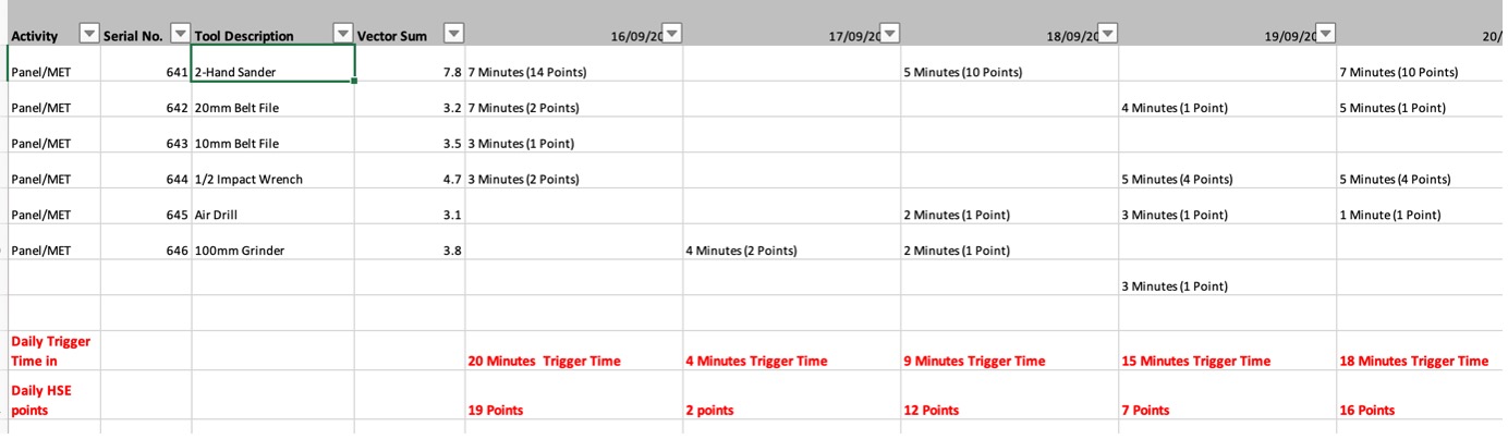 On-Site HAV Testing can give the client full details of every Power Tool used in their workshops plus the vibration reading of each tool together with its Safe Working Time.